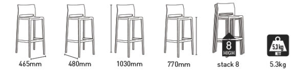 Stackable gas injection polyprop monobloc suitable for indoor and continuous outdoor use. 76cm seat height for bar counters 1050 up to 1150mm high